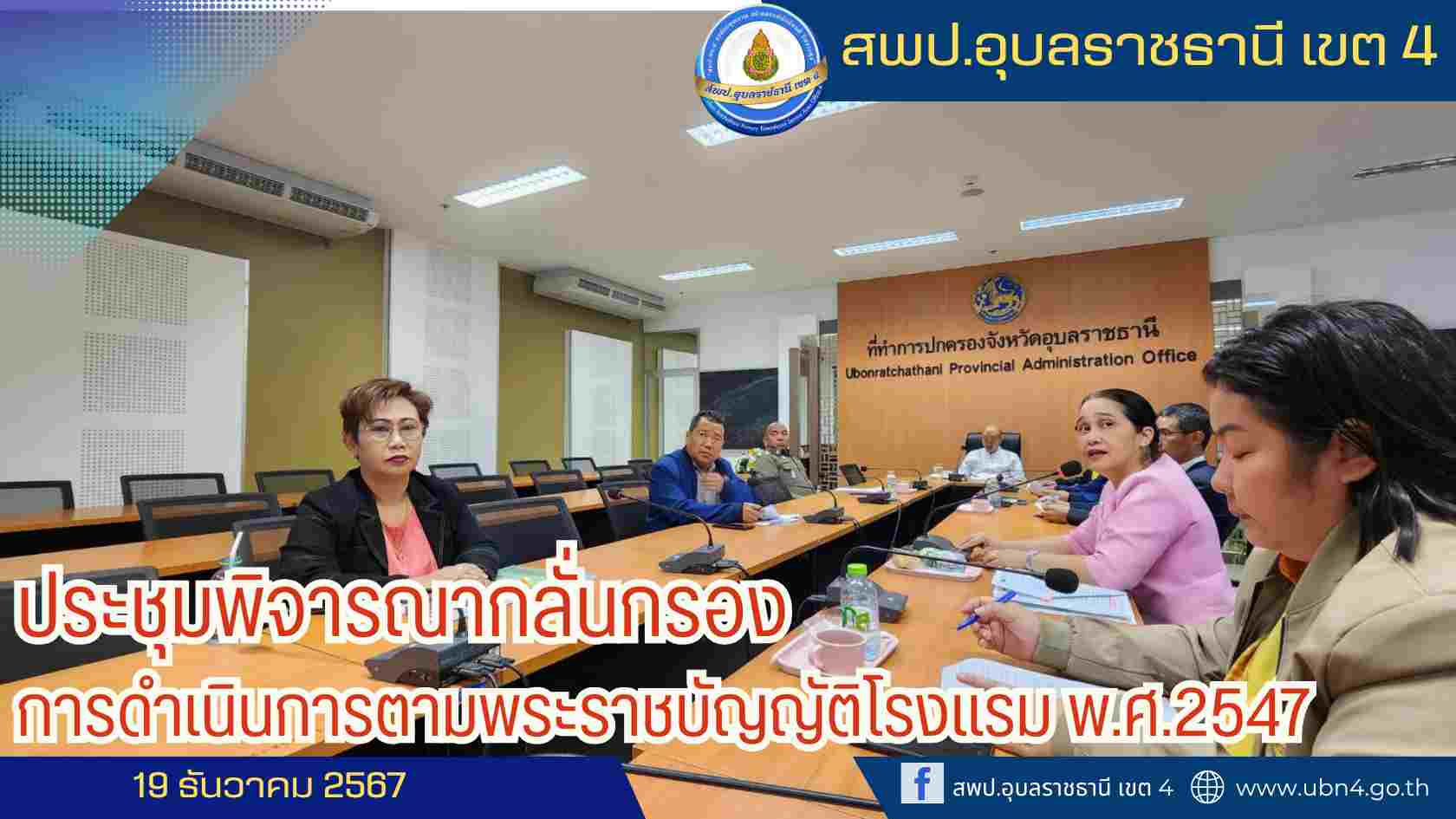 วันที่ 19 ธันวาคม 2567 นางสาวปุณยนุช ดวงศรี ผอ.สพป.อบ.4 มอบหมายให้ สิบเอกหญิงพวงรัตน์ สุธา นักวิชาการศึกษาชำนาญการ สพป.อบ.4 ร่วมประชุมพิจารณากลั่นกรองการดำเนินการตามพระราชบัญญัติโรงแรม พ.ศ.2547 การขอรับใบอนุญาตประกอบธุรกิจโรงแรม 2 แห่ง และขอต่ออายุใบอนุญาตประกอบธุรกิจโรงแรม 5 แห่ง โดย ว่าที่ร้อยตรี กรกฎ ประเสริฐวงษ์ รองผู้ว่าราชการจังหวัดอุบลราชธานี เป็นประธานในที่ประชุม ร่วมกับคณะกรรมการพิจารณากลั่นกรอง ผู้กำกับสถานีตำรวจภูธร สาธารณสุขอำเภอ ปกครองจังหวัด ปกครองอำเภอ หน่วยงานโยธาธิการ สำนักงานวัฒนธรรมจังหวัด ปลัดอำเภอฝ่ายอนุญาตทางปกครอง นักวิชาการศึกษา ณ ห้องประชุม