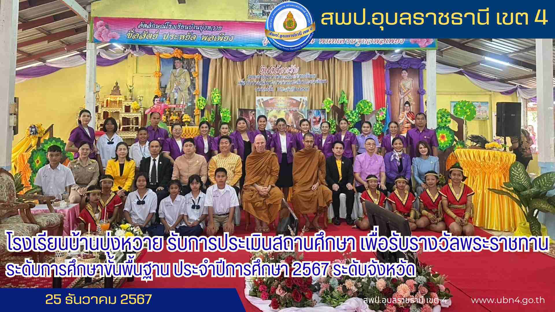 วันที่ 25 ธันวาคม 2567 โรงเรียนบ้านบุ่งหวาย รับการประเมินสถานศึกษาเพื่อรับรางวัลพระราชทาน ระดับจังหวัด (ประเภทสถานศึกษา ระดับประถมศึกษา ขนาดเล็ก) ประกอบด้วย นายเอกลักษณ์ พลศักดิ์ รอง ผอ.สพม.อบ.อจ ประธานกรรมการ,นายณัฐกร สอนวงค์ รอง ผอ.สพป.อบ5, นายพีรกฤต เครือลุนทีระยุทธ ศึกษานิเทศก์ ชพ.สพป.อบ3, นายธีรศักดิ์ บุญทรง ศึกษานิเทศก์ ชพ.สพป.อบ5 , น.ส.ณปภัช บุญสมศรี, น.ส.จามรี เชื้อชัย ศึกษานิเทศก์ ชพ.สพม.อบ.อจ.,นางนิภากร ชลการ ผอ.กลุ่มส่งเสริมการจัดการศึกษา สพม.อบ.อจ. โดยมีนางสาวปุณยนุช ดวงศรี ผอ.สพป.อบ.4 ,ปลัดอำเภอวารินชำราบ ,นายกองค์การบริหารส่วนตำบลบุ่งหวาย ท่านเจ้าคุณพระภาวนา