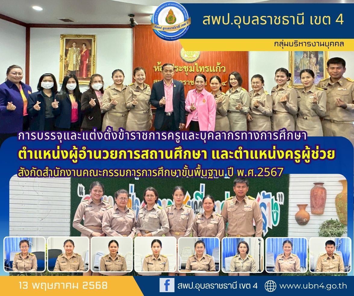 เมื่อวันที่ 13 พฤษภาคม 2568 นางสาวปุณยนุช ดวงศรี ผู้อำนวยการ สพป.อุบลราชธานี เขต 4 ปฐมนิเทศและมอบนโยบายแก่ผู้บริหารสถานศึกษาและครูผู้ช่วย ที่มารายงานตัวเพื่อบรรจุและแต่งตั้งเข้ารับราชการเป็นข้าราชการครูและบุคลากรทางการศึกษา ตำแหน่งครูผู้ช่วย และผู้ได้รับการแต่งตั้งให้ดำรงตำแหน่งผู้อำนวยการสถานศึกษา สังกัดสำนักงานคณะกรรมการการศึกษาขั้นพื้นฐาน ปี พ.ศ.2567 ณ ห้องประชุมไทรแก้ว สำนักงานเขตพื้นที่การศึกษาประถมศึกษาอุบลราชธานี เขต 4