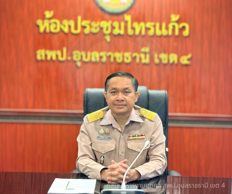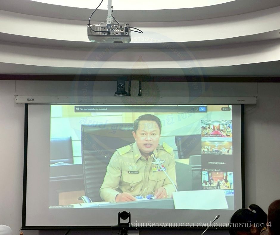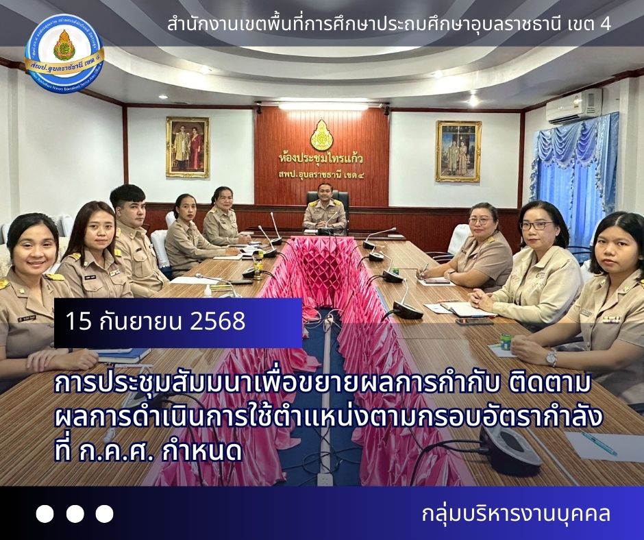 เมื่อวันที่ 15 กันยายน 2568 นางสาวปุณยนุช ดวงศรี ผู้อำนวยการ สพป.อุบลราชธานี เขต 4 มอบหมายให้ นายศักดิ์สิทธิ์ สุภสร รองผู้อำนวยการ สพป.อุบลราชธานี เขต 4 นางสิริวรรณ ปัญญาคง ผู้อำนวยการกลุ่มบริหารงานบุคคล พร้อมด้วยเจ้าหน้าที่กลุ่มบริหารงานบุคคล เข้าร่วมการประชุมเพื่อขยายผลการกำกับ ติดตามผลการดำเนินการใช้ตำแหน่งตามกรอบอัตรากำลังตามที่ ก.ค.ศ.กำหนด และการดำเนินการตามหลักเกณฑ์และวิธีการบริหารงานบุคคลของตำแหน่งบุคลากรทางการศึกษาอื่นตามมาตรา 38 ค.(2) ในเขตพื้นที่การศึกษา ผ่านระบบออนไลน์ (Zoom Meeting) โดยได้รับเกียรติจาก นายเสริมฤทธิ์ หวายฤทธิ์ธนกุล รองเลขาธิการ ก.ค.ศ. เป็นประธานในการประชุม ณ ห้องประชุมไทรแก้วสำนักงานเขตพื้นที่การศึกษาประถมศึกษาอุบลราชธานี เขต 4