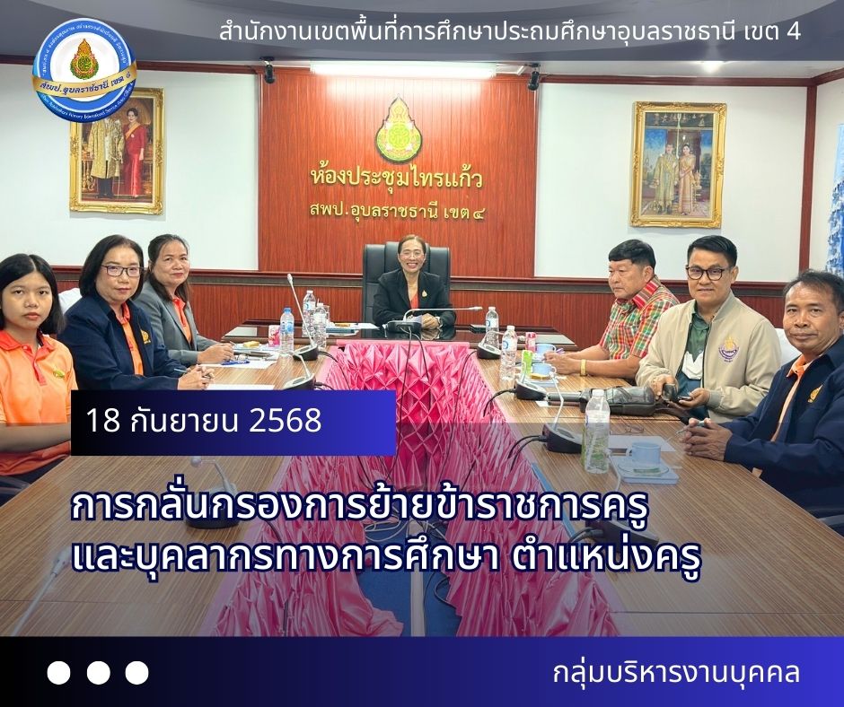 เมื่อวันที่ 18 กันยายน 2568 นางสาวปุณยนุช ดวงศรี ผู้อำนวยการสำนักงานเขตพื้นที่การศึกษาประถมศึกษาอุบลราชธานี เขต 4 เป็นประธานในการประชุมคณะกรรมการกลั่นกรองการย้ายข้าราชการครูและบุคลากรทางการศึกษา ตำแหน่งครู ประจำปี พ.ศ.2568 ครั้งที่ 2 ณ ห้องประชุมไทรแก้ว สำนักงานเขตพื้นที่การศึกษาประถมศึกษาอุบลราชธานี เขต 4
