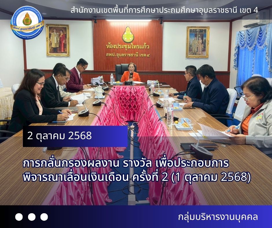 เมื่อวันที่ 2 ตุลาคม 2568 นางสาวปุณยนุช ดวงศรี ผู้อำนวยการ สพป.อุบลราชธานี เขต 4 เป็นประธานในการประชุมคณะกรรมการกลั่นกรองผลงาน รางวัล เพื่อประกอบการพิจารณาเลื่อนเงินเดือน ข้าราชการครูและบุคลากรทางการศึกษา ครั้งที่ 2 (1 ตุลาคม 2568) ณ ห้องประชุมไทรแก้ว สำนักงานเขตพื้นที่การศึกษาประถมศึกษาอุบลราชธานี เขต 4