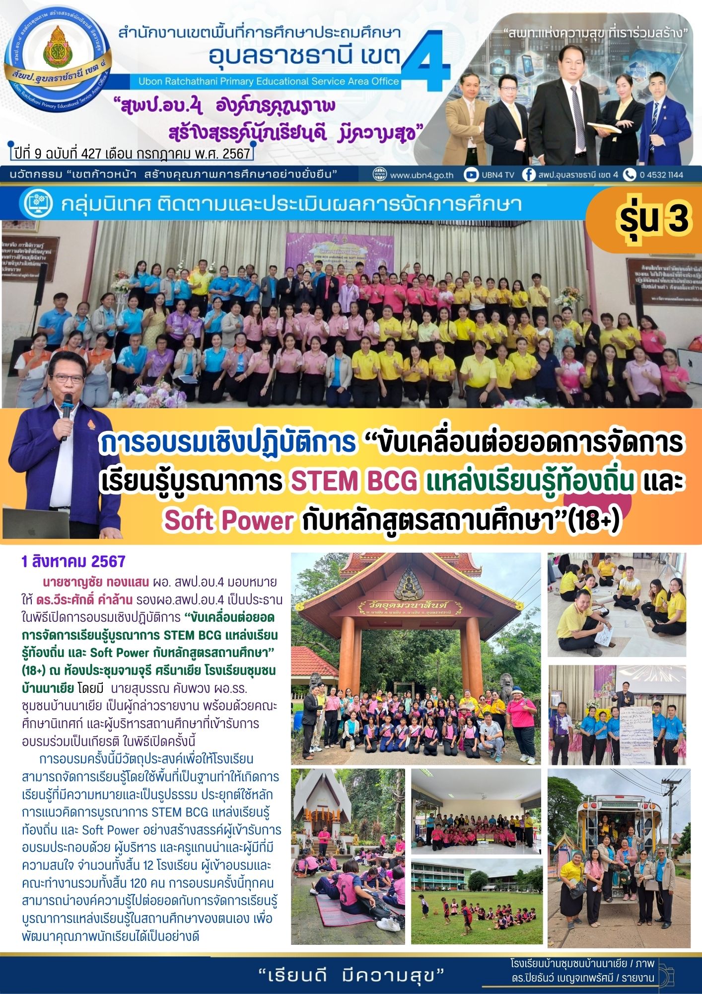 การอบรมเชิงปฏิบัติการ "ขับเคลื่อนต่อยอดการจัดการเรียนรู้บูรณาการ STEM BCG แหล่งเรียนรู้ท้องถิ่น และ Soft Power กับหลักสูตรสถานศึกษา"(18+) จดหมายข่าวกลุ่มนิเทศ ติดตามและประเมินผลการจัดการศึกษา ก่อนหน้า ต่อไป