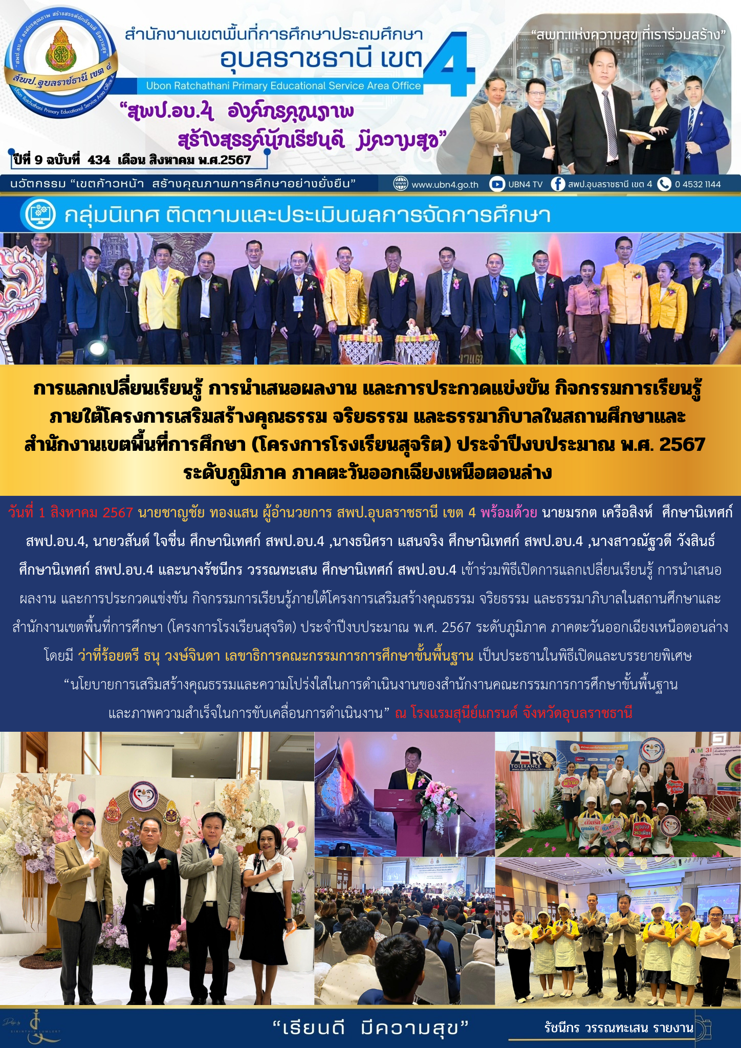 การแลกเปลี่ยนเรียนรู้ การนำเสนอผลงานและการประกวดแข่งขัน กิจกรรมการเรียนรู้ภายใต้โครงการเสริมสร้างคุณธรรม จริยธรรม และธรรมาภิบาลในสถานศึกษาและสำนักงานเขตพื้นที่การศึกษา (โครงการโรงเรียนสุจริต) ประจำปีงบประมาณ พ.ศ. 2567 ระดับภูมิภาค ภาคตะวันออกเฉียงเหนือตอน จดหมายข่าวกลุ่มนิเทศ ติดตามและประเมินผลการจัดการศึกษา ภารกิจ ผอ.สพป.อุบลราชธานี เขต 4 ก่อนหน้า ต่อไป