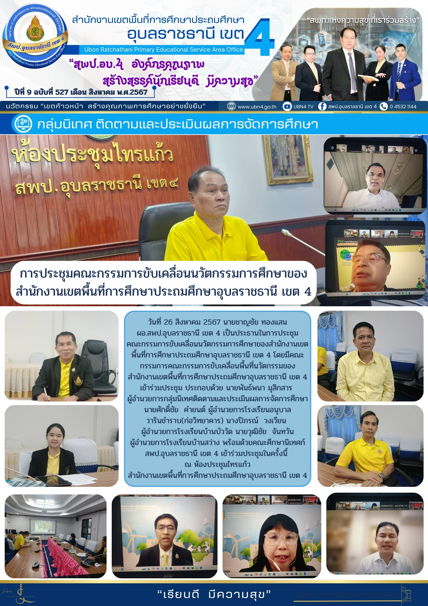 การประชุมคณะกรรมการขับเคลื่อนนวัตกรรมการศึกษาของ สำนักงานเขตพื้นที่การศึกษาประถมศึกษาอุบลราชธานี เขต 4 จดหมายข่าวกลุ่มนิเทศ ติดตามและประเมินผลการจัดการศึกษา ภารกิจ ผอ.สพป.อุบลราชธานี เขต 4 ก่อนหน้า ต่อไป