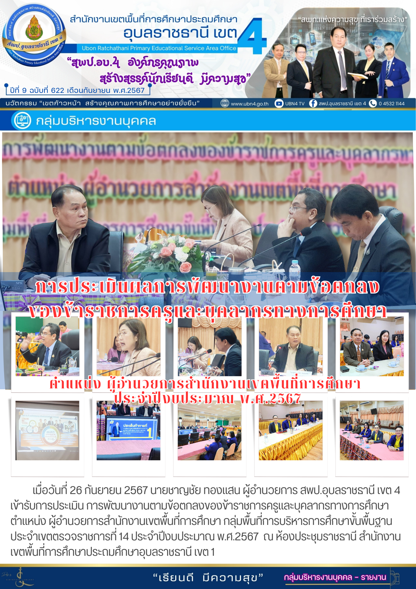 การประเมินผลการพัฒนางานตามข้อตกลงของข้าราชการครูและบุคลากรทางการศึกษา ตำแหน่ง ผู้อำนวยการสำนักงานเขตพื้นที่การศึกษา ประจำปีงบประมาณ พ.ศ.2567 จดหมายข่าวกลุ่มบริหารงานบุคคล ภารกิจ ผอ.สพป.อุบลราชธานี เขต 4 ก่อนหน้า ต่อไป