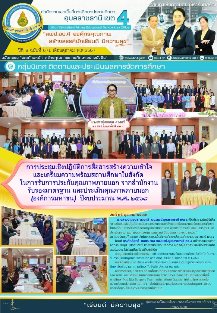 การประชุมเชิงปฏิบัติการสื่อสารสร้างความเข้าใจและเตรียมความพร้อมสถานศึกษาในสังกัด ในการรับการประกันคุณภาพภายนอก จากสำนักงานรับรองมาตรฐานและประเมินคุณภาพภายนอก (องค์การมหาชน) ปีงบประมาณ พ.ศ. 2568 จดหมายข่าวกลุ่มนิเทศ ติดตามและประเมินผลการจัดการศึกษา ภารกิจ ผอ.สพป.อุบลราชธานี เขต 4 ภารกิจ ดร.ศักดิ์สิทธิ์ สุภสร ก่อนหน้า ต่อไป