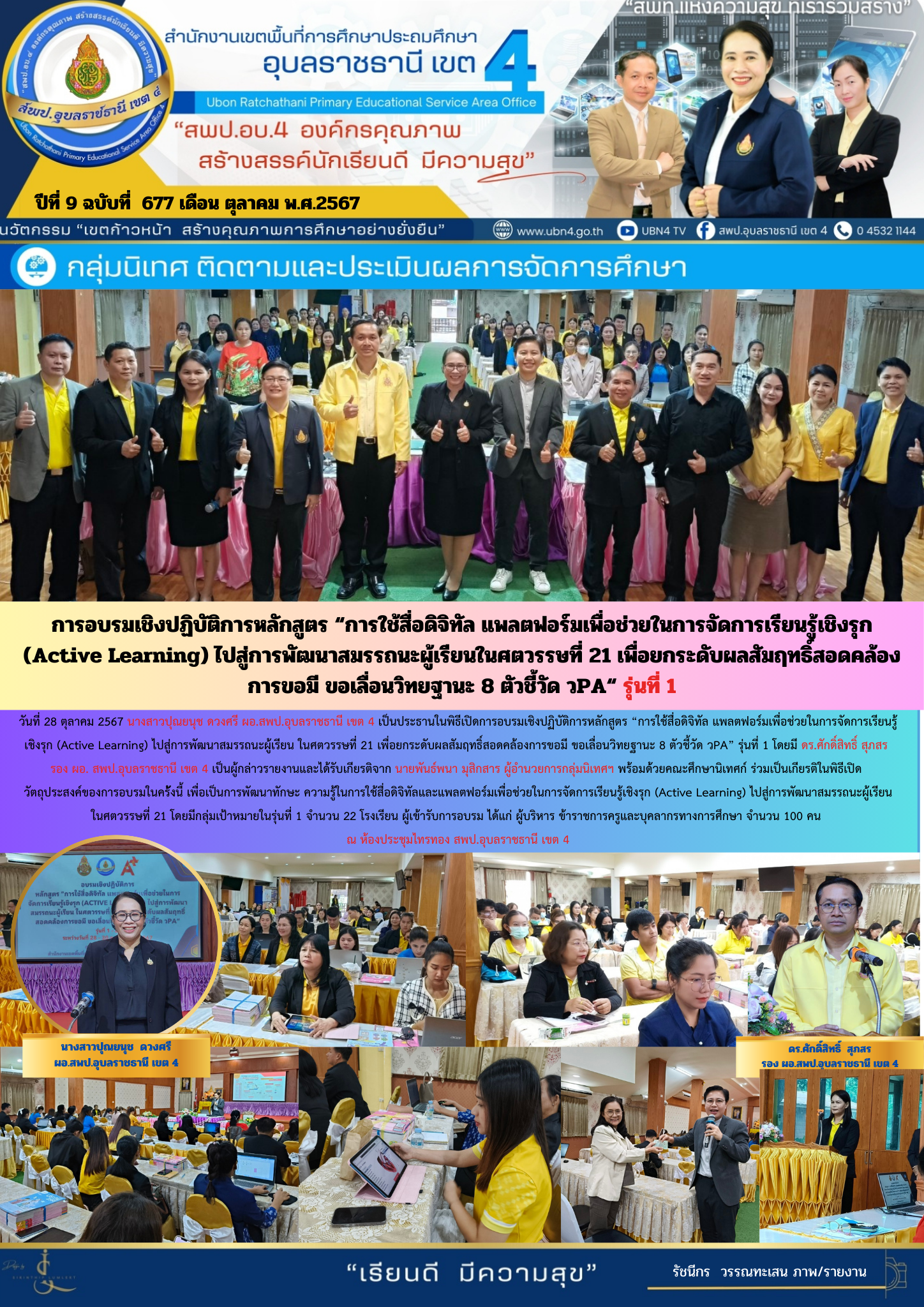 การอบรมเชิงปฏิบัติการหลักสูตร "การใช้สื่อดิจิทัล แพลตฟอร์มเพื่อช่วยในการจัดการเรียนรู้เชิงรุก (Active Learning) ไปสู่การพัฒนาสมรรถนะผู้เรียนในศตวรรษที่ 21 เพื่อยกระดับผลสัมฤทธิ์สอดคล้องการขอมี ขอเลื่อนวิทยะฐานะ 8 ตัวชี้วัด วPA" รุ่นที่ 1 จดหมายข่าวกลุ่มนิเทศ ติดตามและประเมินผลการจัดการศึกษา ภารกิจ ผอ.สพป.อุบลราชธานี เขต 4 ภารกิจ ดร.ศักดิ์สิทธิ์ สุภสร ก่อนหน้า ต่อไป