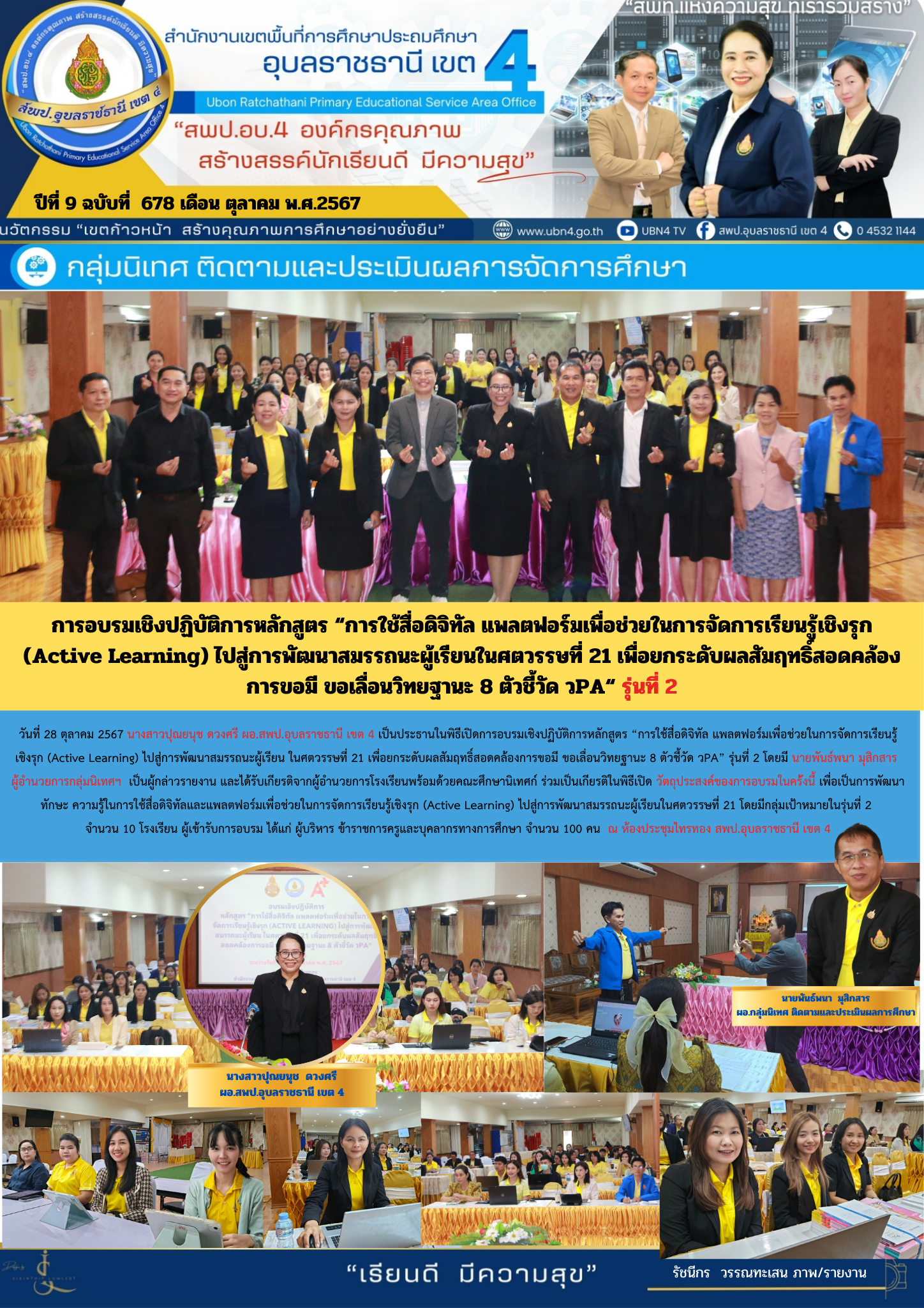 การอบรมเชิงปฏิบัติการหลักสูตร "การใช้สื่อดิจิทัล แพลตฟอร์มเพื่อช่วยในการจัดการเรียนรู้เชิงรุก (Active Learning) ไปสู่การพัฒนาสมรรถนะผู้เรียนในศตวรรษที่ 21 เพื่อยกระดับผลสัมฤทธิ์สอดคล้องการขอมี ขอเลื่อนวิทยะฐานะ 8 ตัวชี้วัด วPA"(รุ่นที่ 2) จดหมายข่าวกลุ่มนิเทศ ติดตามและประเมินผลการจัดการศึกษา ภารกิจ ผอ.สพป.อุบลราชธานี เขต 4 ก่อนหน้า ต่อไป
