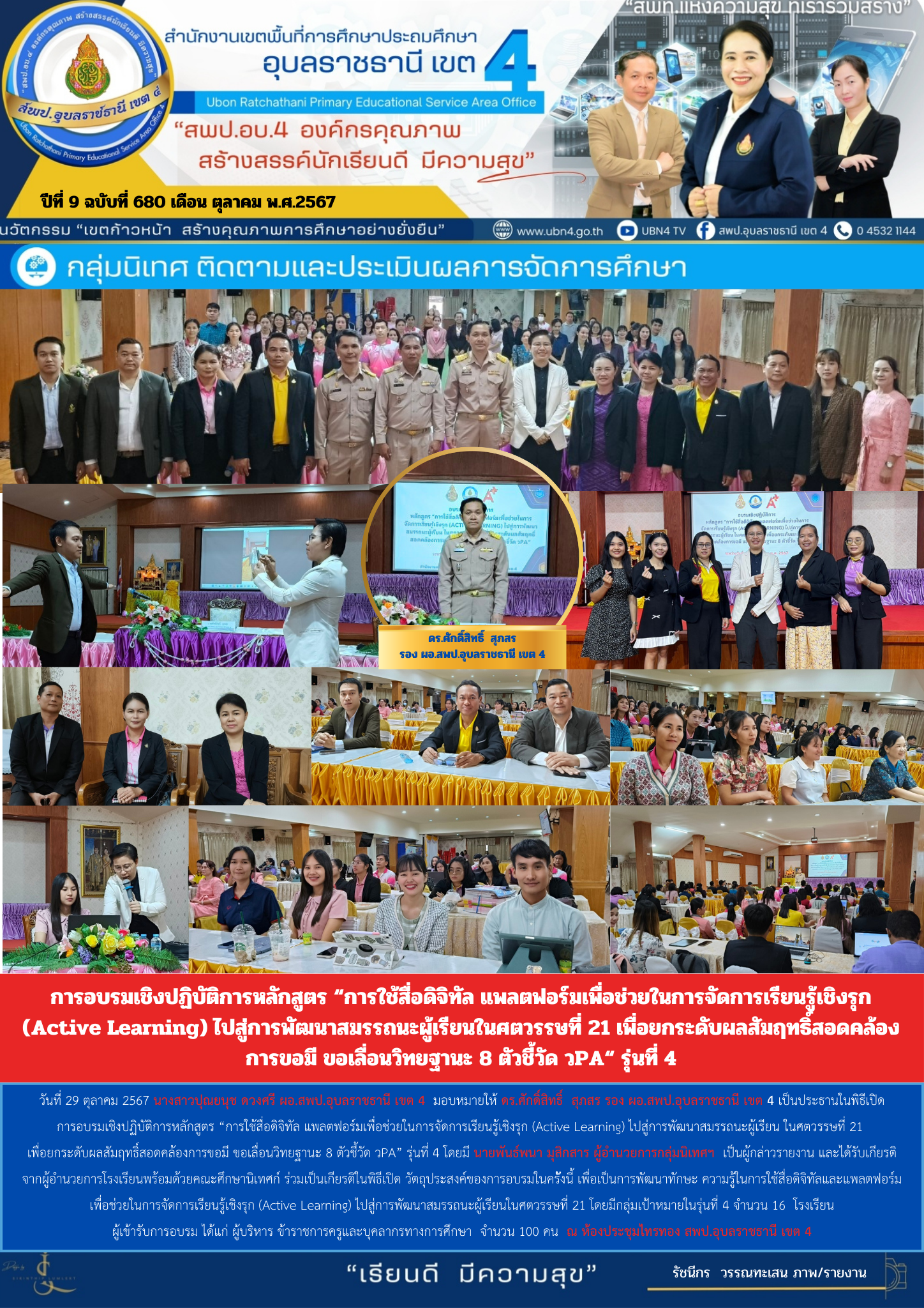การอบรมเชิงปฏิบัติการหลักสูตร "การใช้สื่อดิจิทัล แพลตฟอร์มเพื่อช่วยในการจัดการเรียนรู้เชิงรุก (Active Learning) ไปสู่การพัฒนาสมรรถนะผู้เรียนในศตวรรษที่ 21 เพื่อยกระดับผลสัมฤทธิ์สอด คล้องการขอมี ขอเลื่อนวิทยะฐานะ 8 ตัวชี้วัด วPA"(รุ่นที่ 4) จดหมายข่าวกลุ่มนิเทศ ติดตามและประเมินผลการจัดการศึกษา ภารกิจ ดร.ศักดิ์สิทธิ์ สุภสร ก่อนหน้า ต่อไป