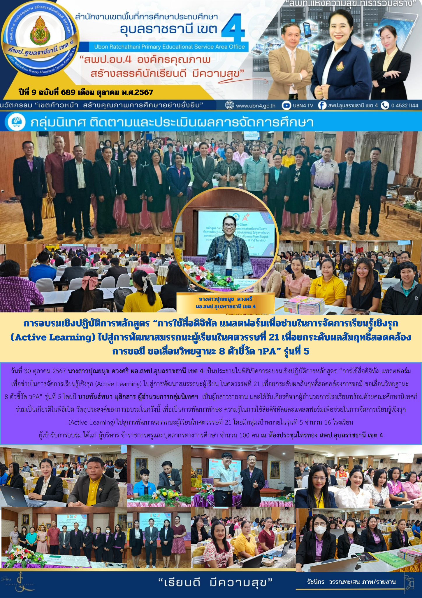 การอบรมเชิงปฏิบัติการหลักสูตร "การใช้สื่อดิจิทัล แพลตฟอร์มเพื่อช่วยในการจัดการเรียนรู้เชิงรุก (Active Learning) ไปสู่การพัฒนาสมรรถนะผู้เรียนในศตวรรษที่ 21 เพื่อยกระดับผลสัมฤทธิ์สอด คล้องการขอมี ขอเลื่อนวิทยะฐานะ 8 ตัวชี้วัด วPA"(รุ่นที่ 5) จดหมายข่าวกลุ่มนิเทศ ติดตามและประเมินผลการจัดการศึกษา ภารกิจ ผอ.สพป.อุบลราชธานี เขต 4 ก่อนหน้า ต่อไป