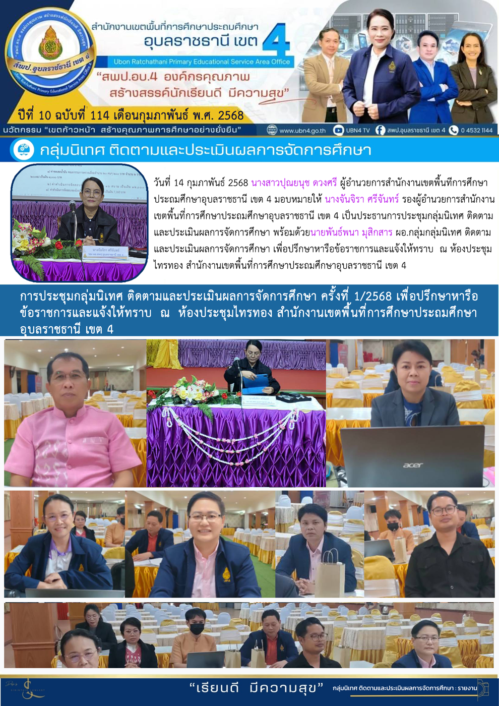 การประชุมกลุ่มนิเทศ ติดตามและประเมินผลการจัดการศึกษา ครั้งที่ 1/2568 เพื่อปรึกษาหารือข้อราชการและแจ้งให้ทราบ ณ ห้องประชุมไทรทอง สำนักงานเขตพื้นที่การศึกษาประถมศึกษาอุบลราชธานี เขต 4 ภารกิจ นางจันจิรา ศรีจันทร์ ก่อนหน้า ต่อไป