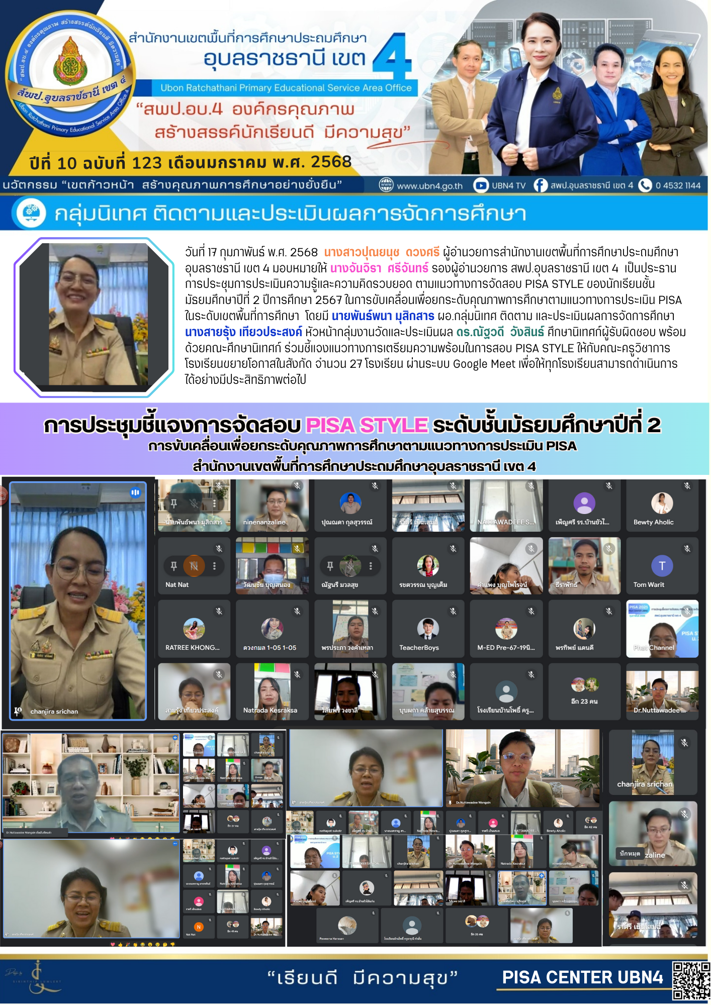 การประชุมชี้แจงการจัดสอบ PISA STYLE ระดับชั้นมัธยมศึกษาปีที่ 2 การขับเคลื่อนเพื่อยกระดับคุณภาพการศึกษาตามแนวทางการประเมิน PISA สพป.อบ.4 ภารกิจ นางจันจิรา ศรีจันทร์ ก่อนหน้า ต่อไป
