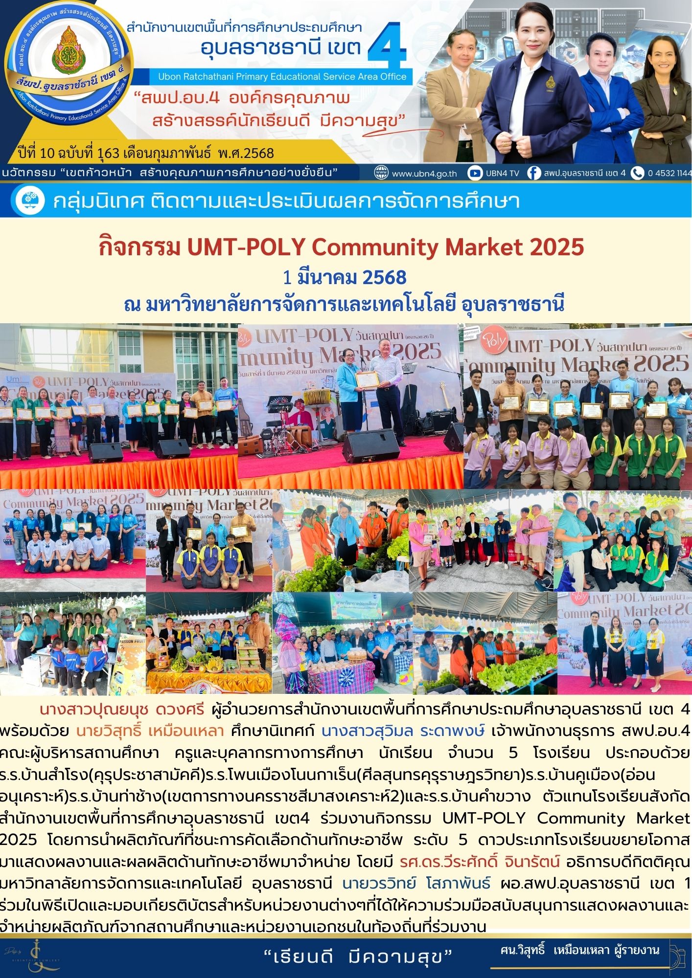 กิจกรรม UMT-POLY Community Market 2025 วันที่ 1 มีนาคม 2568 ณ มหาวิทยาลัยการจัดการและเทคโนโลยี อุบลราชธานี ภารกิจ ผอ.สพป.อุบลราชธานี เขต 4 ก่อนหน้า ต่อไป