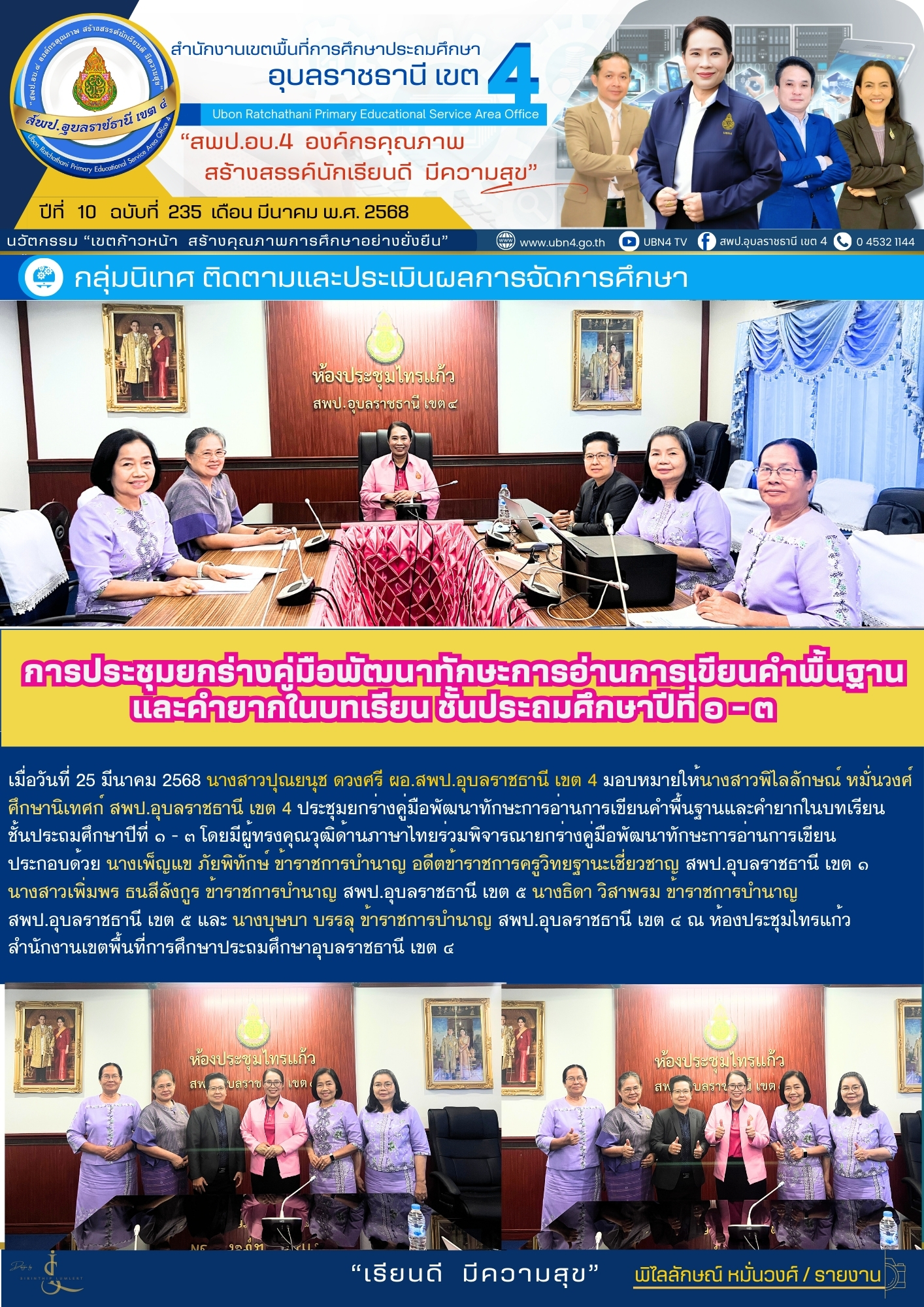 การประชุมยกร่างคู่มือพัฒนาทักษะการอ่านการเขียนคำพื้นฐานและคำยากในบทเรียน ชั้นประถมศึกษาปีที่ ๑-๓ ภารกิจ ผอ.สพป.อุบลราชธานี เขต 4 ก่อนหน้า ต่อไป