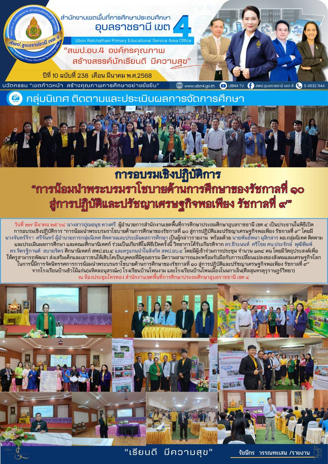 การอบรมเชิงปฏิบัติการ "การน้อมนำพระบรมราโชบายด้านการศึกษาของรัชกาลที่ ๑๐ สู่การปฏิบัติและปรัชญาเศรษฐกิจพอเพียง รัชกาลที่ ๙" ภารกิจ ผอ.สพป.อุบลราชธานี เขต 4 ก่อนหน้า ต่อไป