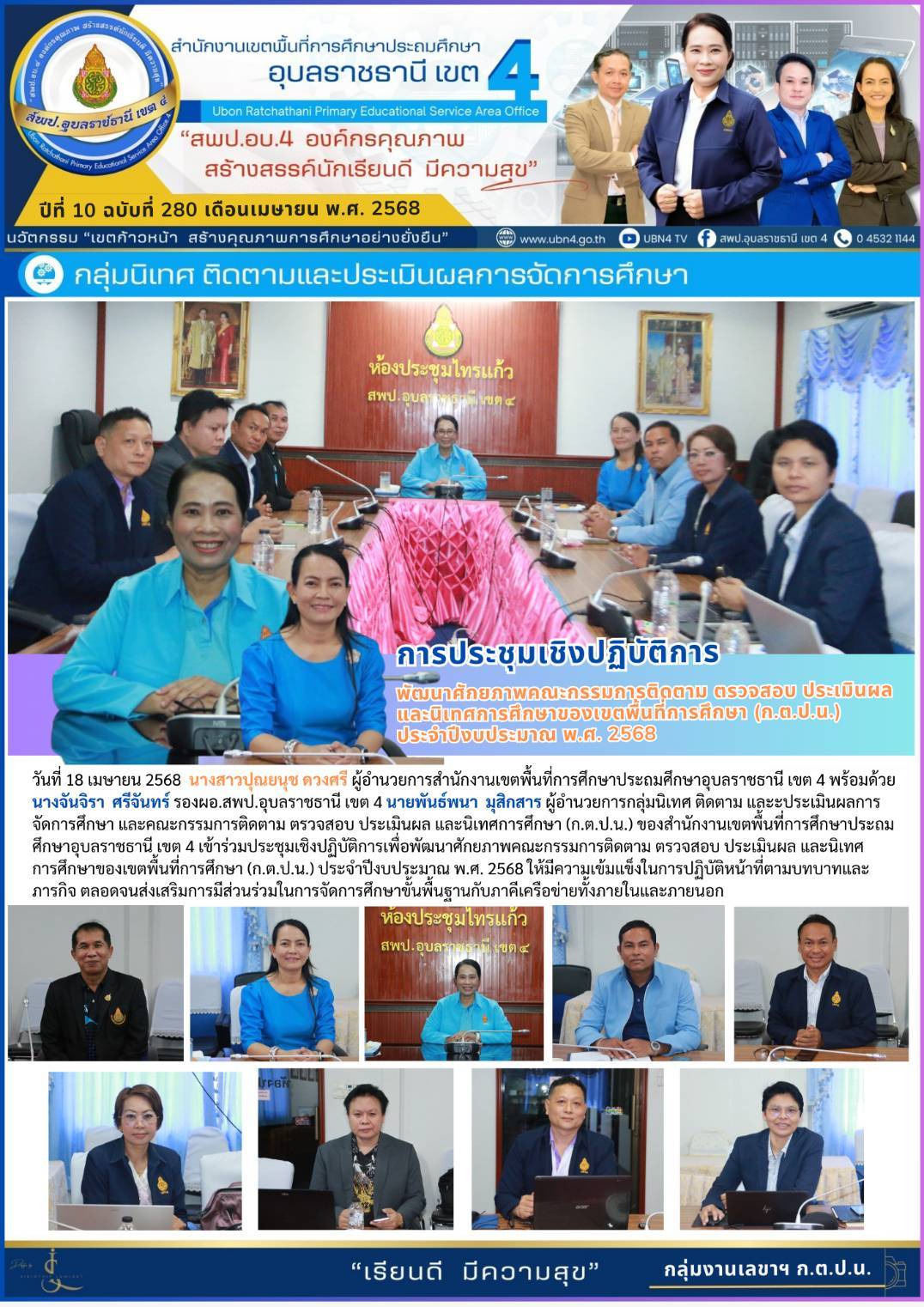 การประขุมเชิงปฏิบัติการ พัฒนาศักยภาพคณะกรรมการติดตาม ตรวจสอบ ประเมินผลและนิเทศการศึกษาของเขตพื้นที่การศึกษา (ก.ต.ป.น.) ประจำปีงบประมาณ พ.ศ. 2568 ภารกิจ ผอ.สพป.อุบลราชธานี เขต 4 ภารกิจ นางจันจิรา ศรีจันทร์ ก่อนหน้า ต่อไป